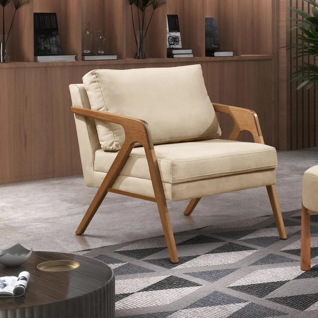 Um é bom, mas duas poltronas beges trazem calma, elegância e acolhimento ao ambiente.
